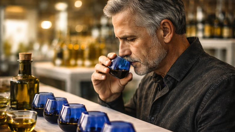 Professionele proefpanels beoordelen de olie op geur, smaak en eventuele defecten. Alleen oliën zonder fouten en met duidelijke fruitige aroma’s mogen als extra vierge worden geclassificeerd.